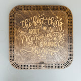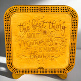 Enjoy timeless fun with our 10-inch square wooden cribbage board, crafted with care and engraved with the quote: “The best thing about memories is making them.” This keepsake board is designed for both play and display, making it a meaningful addition to family game nights.